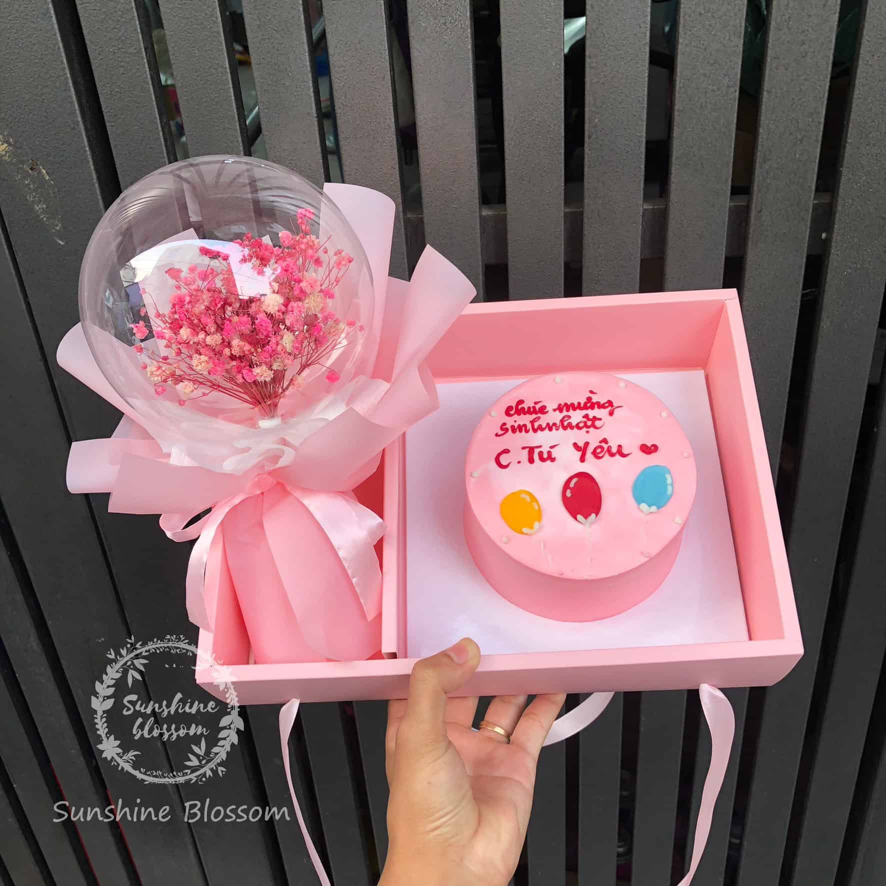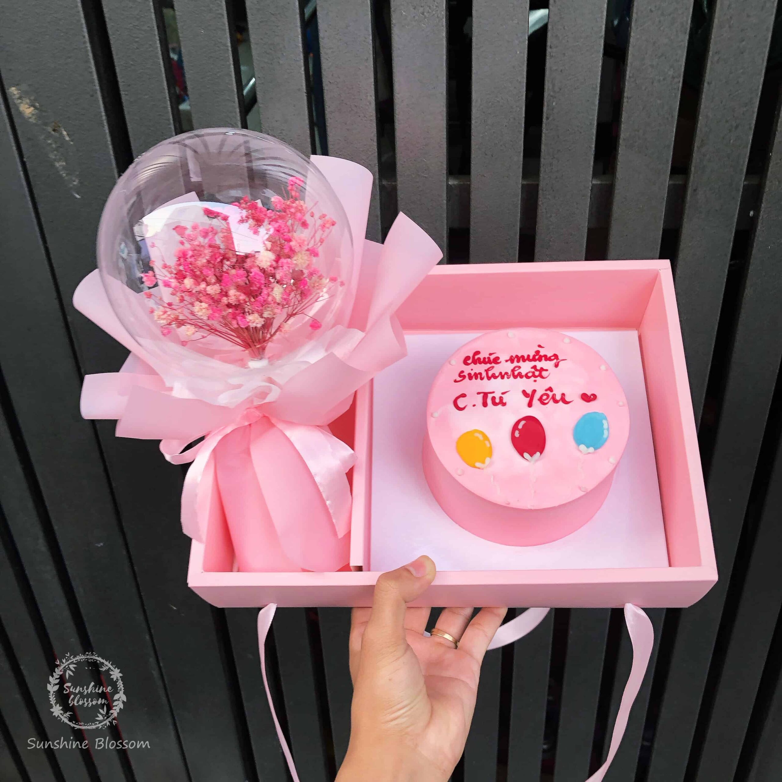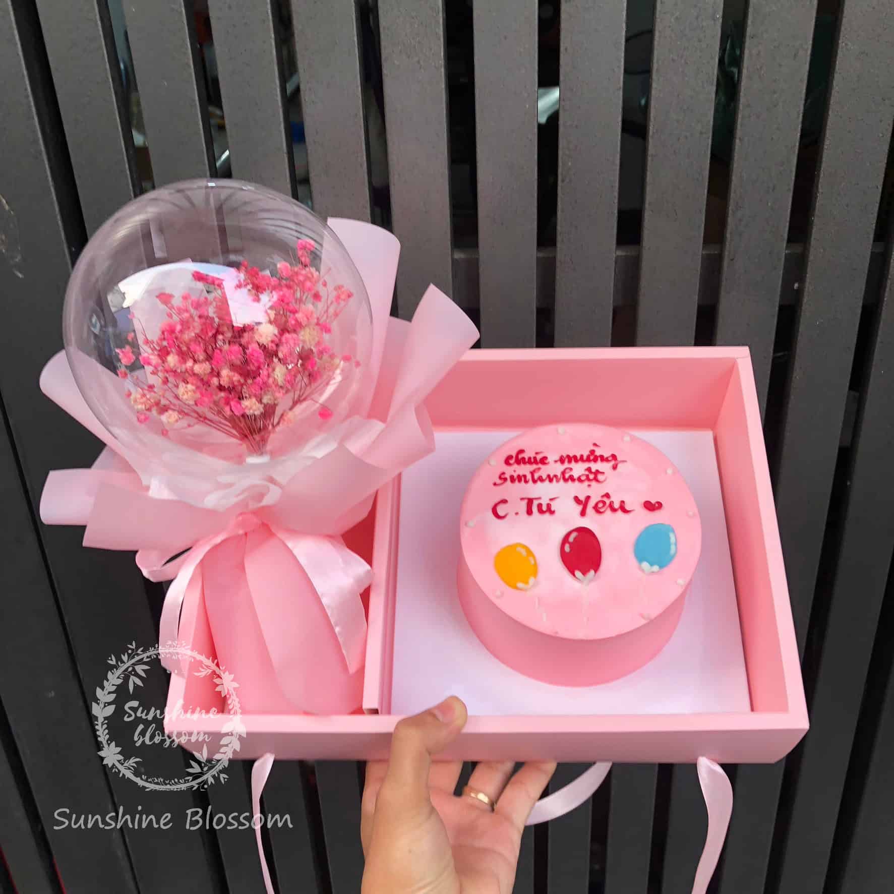 Bánh kem và hoa HFC137 gồm 01 bánh kem, 01 bó bóng hoa baby. Set tặng kèm 01 cây nến nhũ và 01 thiệp cài hộp mẫu ngẫu nhiên.