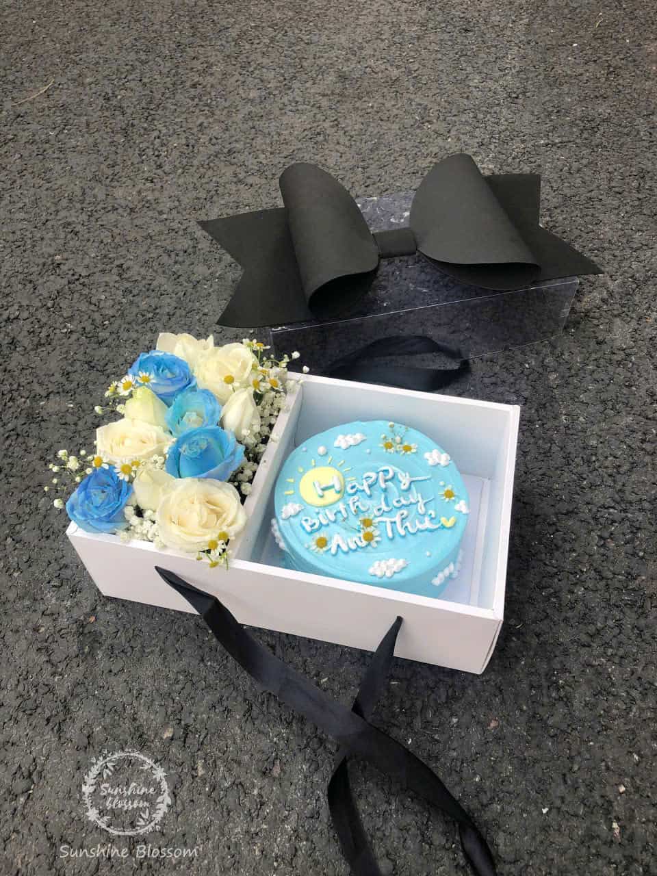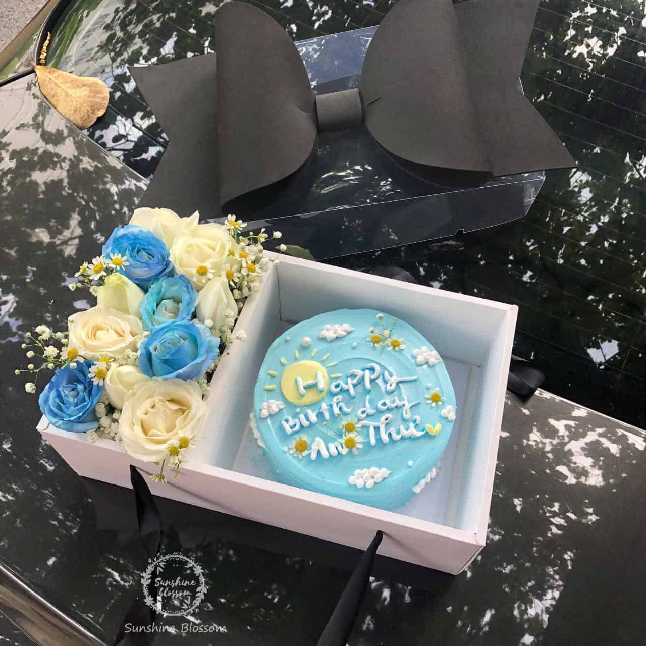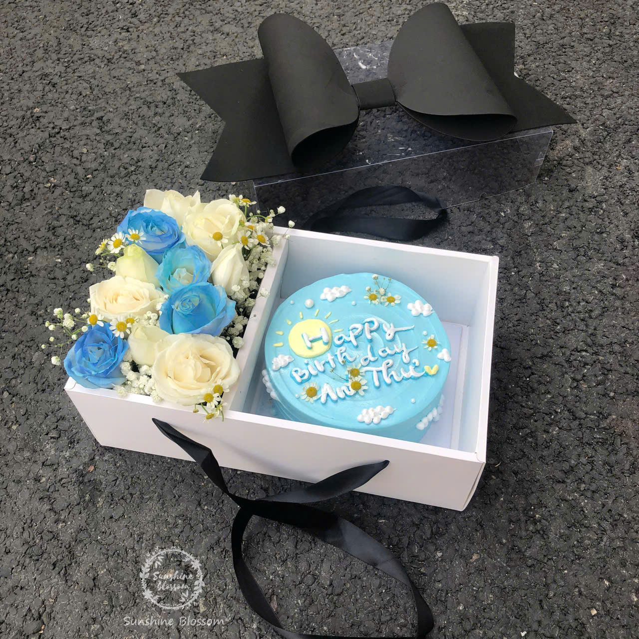 Combo Bánh kem HFC140 gồm 1 bánh kem size XM + hoa hồng đà lạt tươi. Set tặng kèm 01 cây nến nhũ, dao, muỗng, đĩa và 01 thiệp cài hộp mẫu ngẫu nhiên.