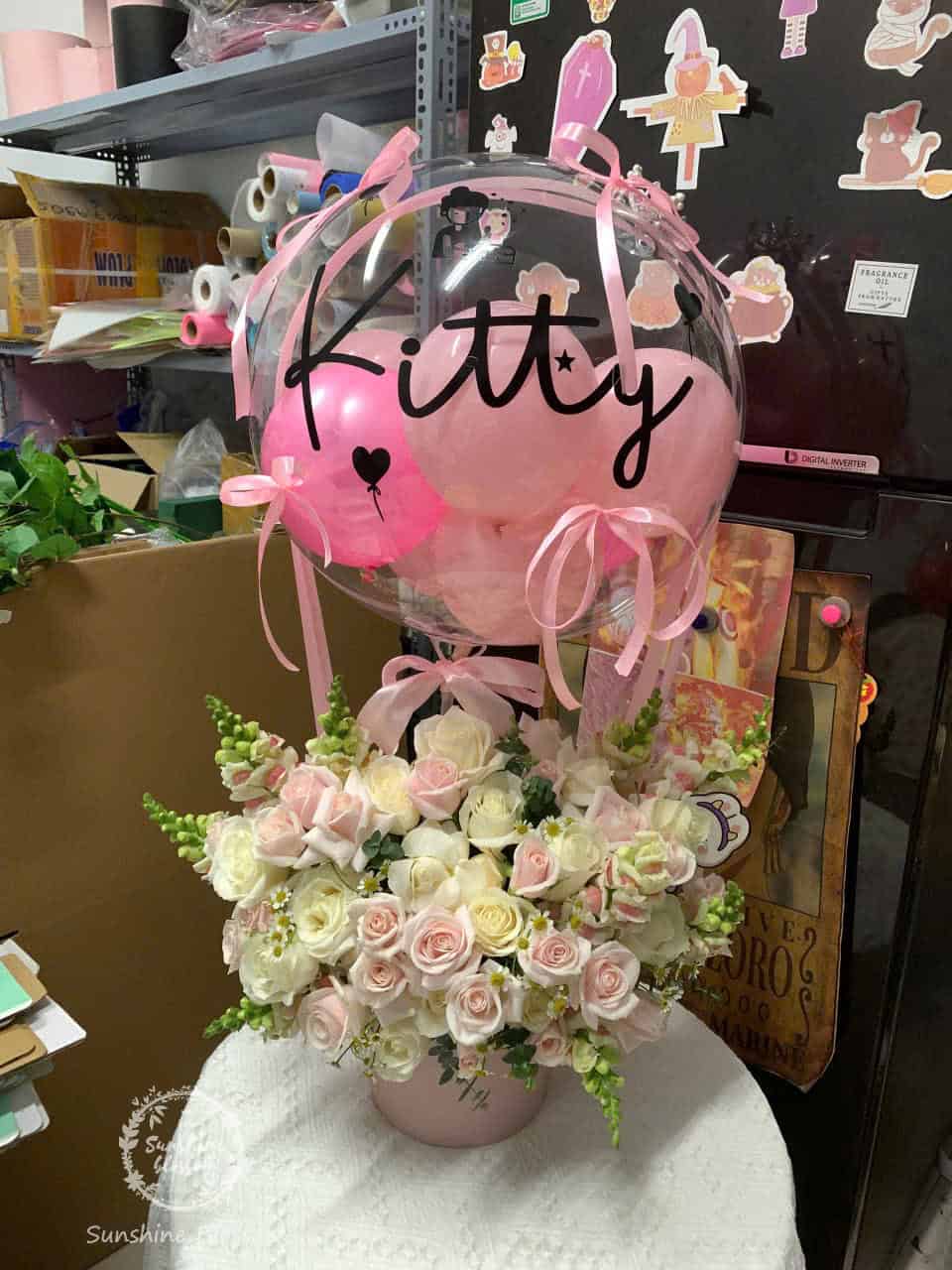 Hộp gồm hoa hồng Đà Lạt màu trắng, hồng, mix cùng mõm sõi, lá bạc, hoa tana và 1 bóng trong suốt có chữ. Sản phẩm đã bao gồm chữ dán/ viết lên bóng và có tặng kèm 1 thiệp/ tag handmade.