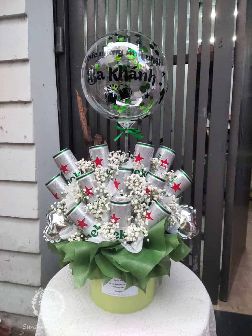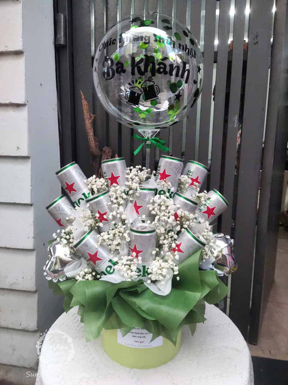Hộp hoa bia heineken HTU043 gồm 12 lon heineken silver, 2 bóng nhỏ, 1 bóng to và hoa baby tươi trang trí. Giá sản phẩm đã bao gồm chữ dán/ viết lên bóng. Sản phẩm có tặng kèm 1 thiệp/ tag/banner .