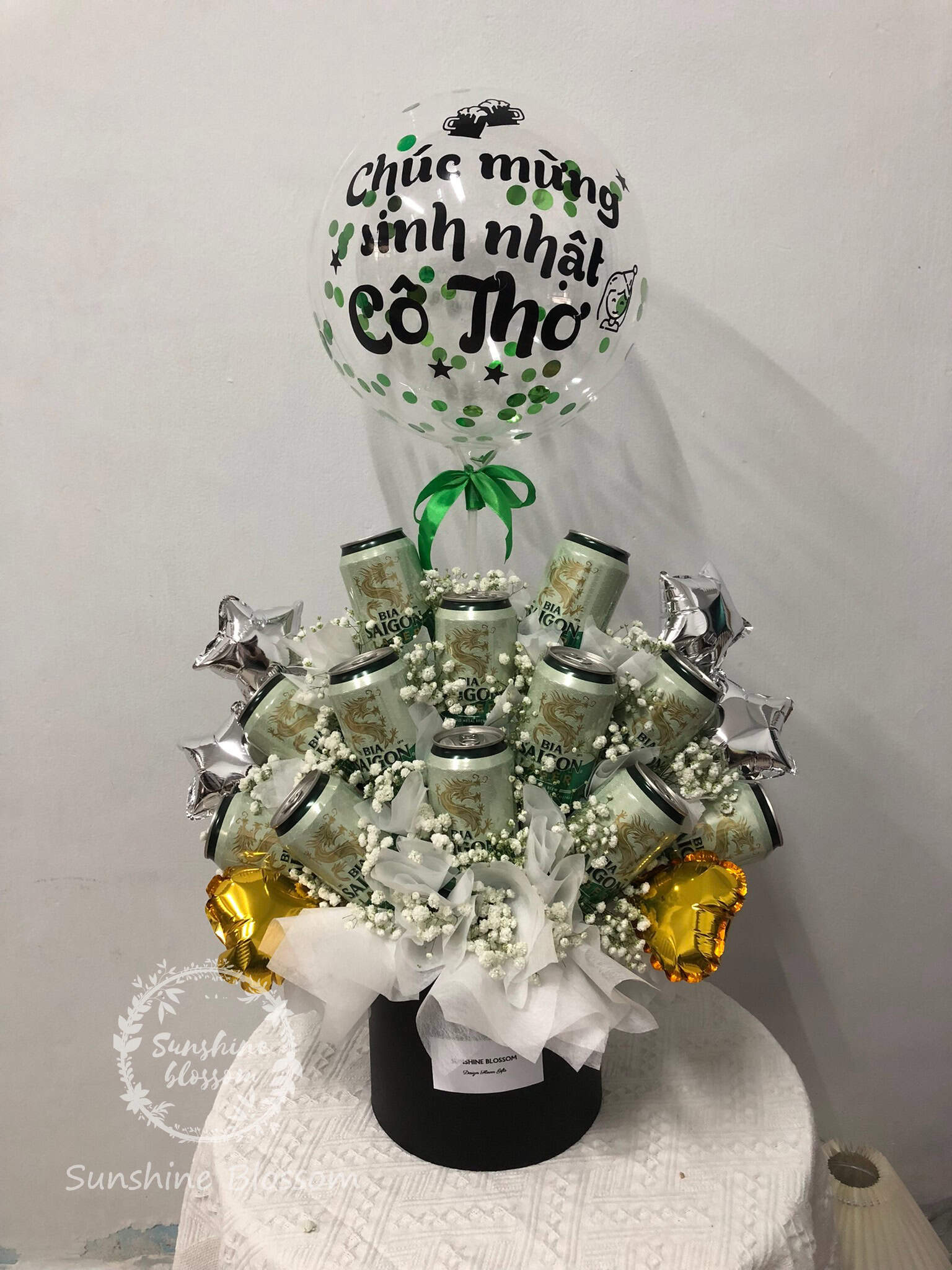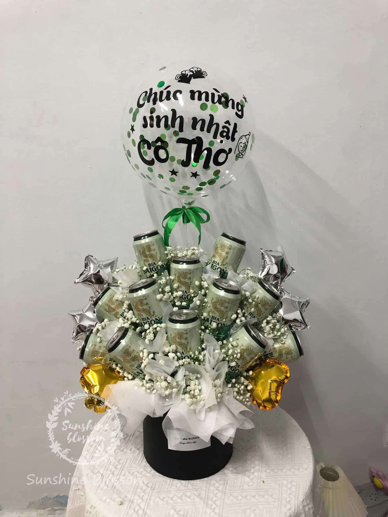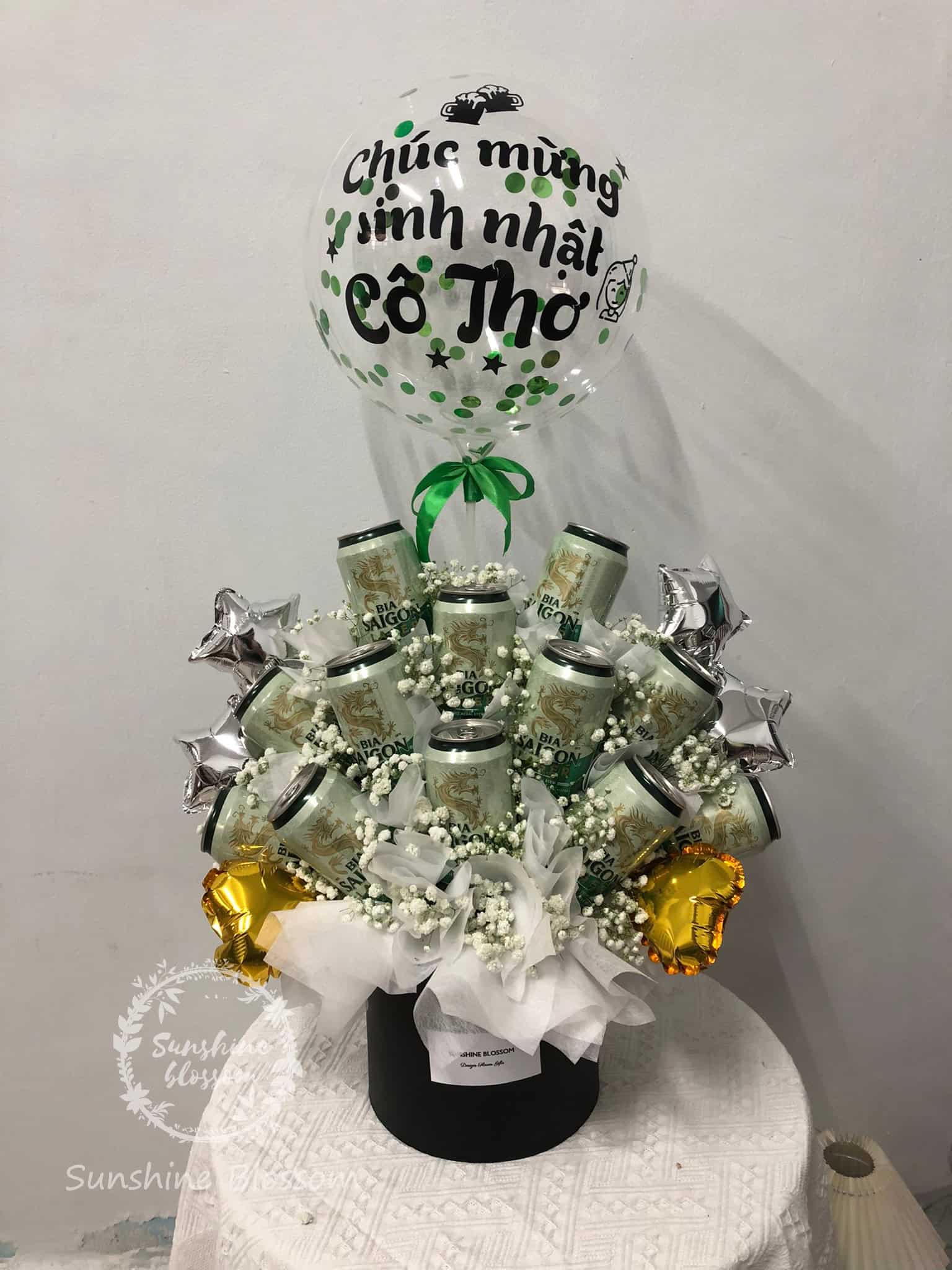 Hộp hoa bia Sài Gòn HTU047 gồm 12 lon Sài Gòn, 6 bóng nhỏ, 1 bóng to và hoa baby trang trí. Giá sản phẩm đã bao gồm chữ dán/ viết lên bóng. Sản phẩm có tặng kèm 1 thiệp/ tag/banner .