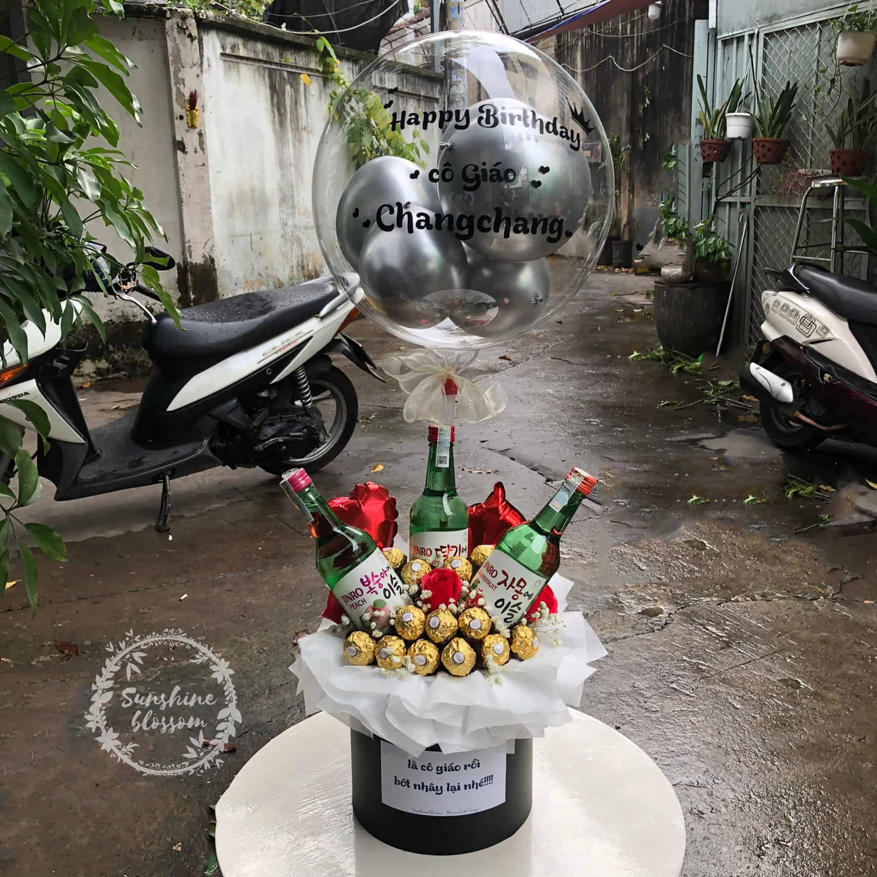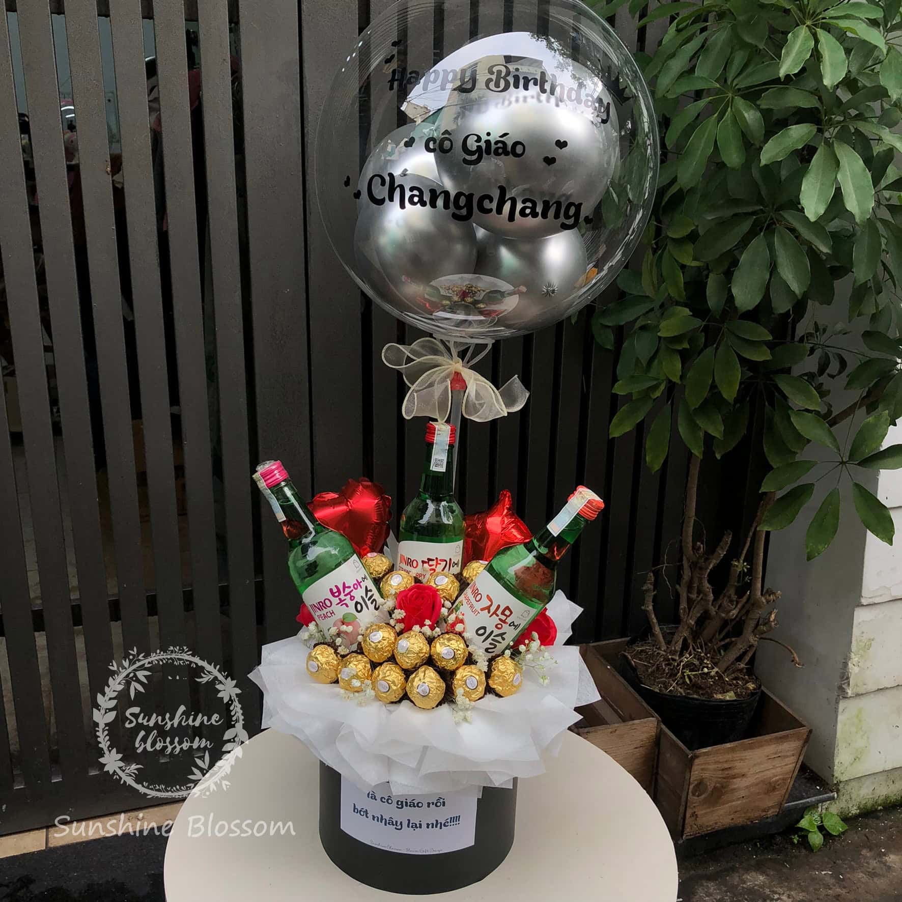Hộp hoa bánh kẹo socola bao gồm 15 viên Socola Ferrero Rocher mix 3 bông hồng sáp + 3 soju + 2 bóng nhỏ + 1 bóng trong suốt có nhiều bóng nhỏ bên trong